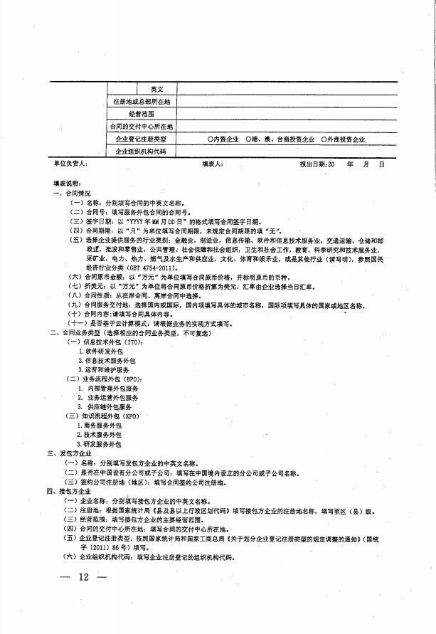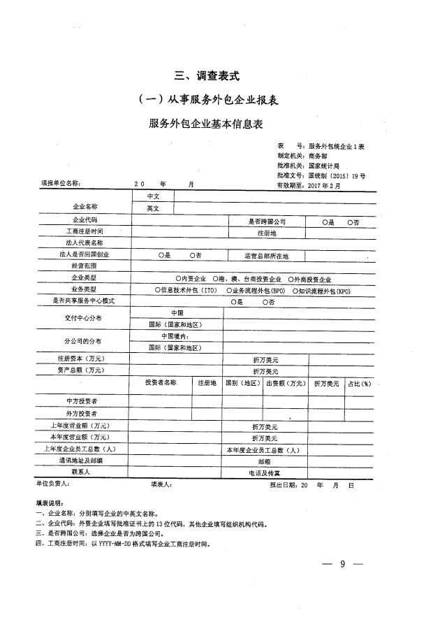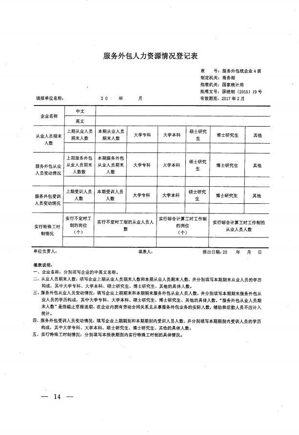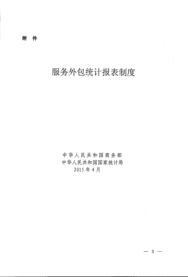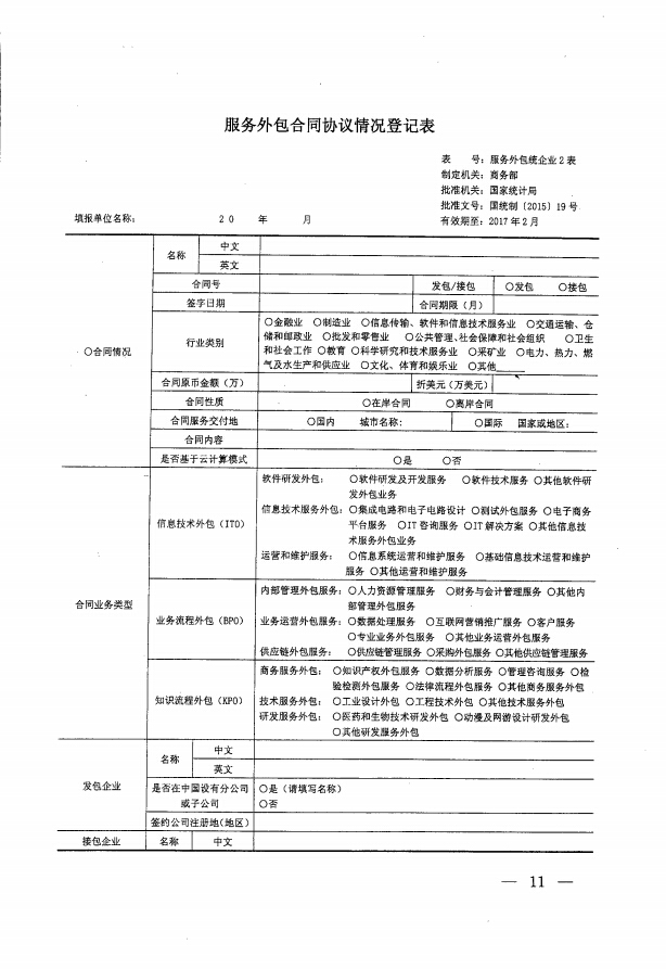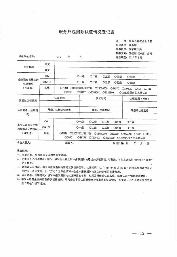 4月,商务部和国家统计局共同发布了2015年的《服务外包统计报表制度》,对服务外包的内涵和外延作出了更科学的界定方法,同时健全了服务外包统计指标体系和统计制度。与之前统计制度比较,服务外包的涵盖面更广,分类更细致。新的统计报表制度如下: