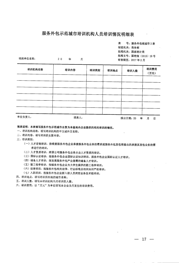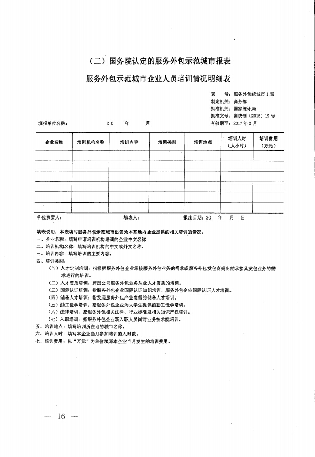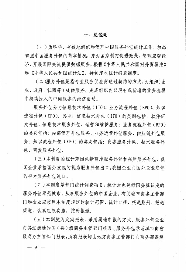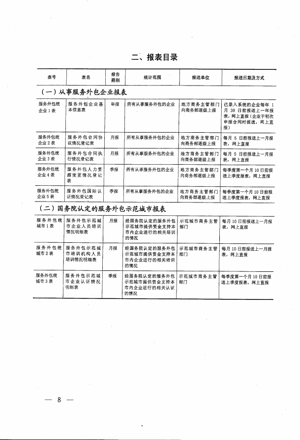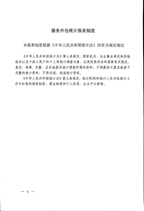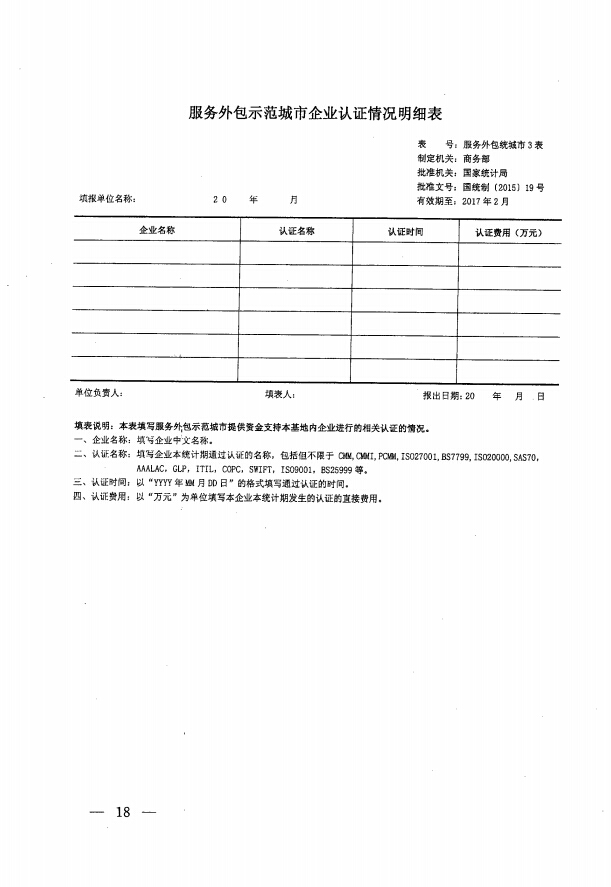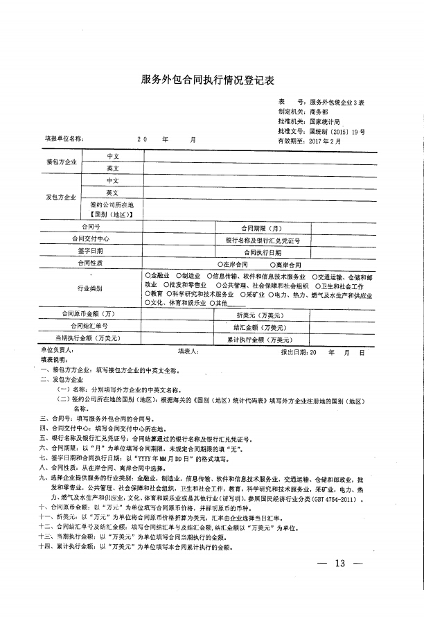 4月,商务部和国家统计局共同发布了2015年的《服务外包统计报表制度》,对服务外包的内涵和外延作出了更科学的界定方法,同时健全了服务外包统计指标体系和统计制度。与之前统计制度比较,服务外包的涵盖面更广,分类更细致。新的统计报表制度如下: