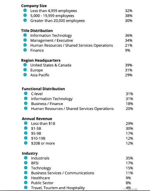 这份人力资源技术调查目的在于深入了解全球人力资源技术和服务现状与需求趋势。调查报告收集了271家公司的见解,这些公司代表了在全球关键地理区域运营的行业的各个领域。该报告基于先前的研究跟踪了市场趋势是如何演变的,并考察了企业在数字化转型过程中的成熟度。受调研公司基础背景如下: