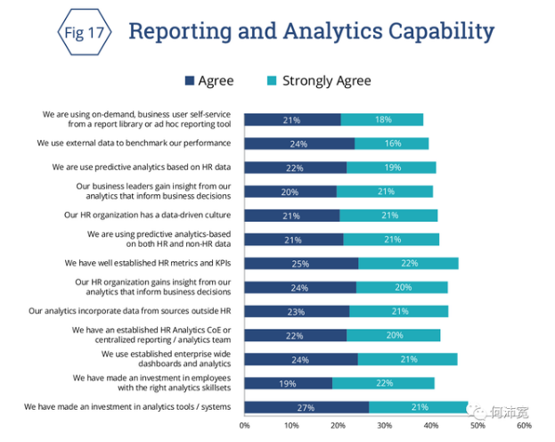 先进的分析被视为下一个阶段的组织能力。在过去几年中,人力资源主管对增强分析能力的需求不断增长,HCM供应商不断巩固和加强其分析产品,但许多人过去采取了“观望”的方式。现在,随着这些产品变得越来越成熟,分析的单一功能与运营报告向企业仪表盘和高级智能分析升级。图17呈现了关于人力资源分析的响应。
