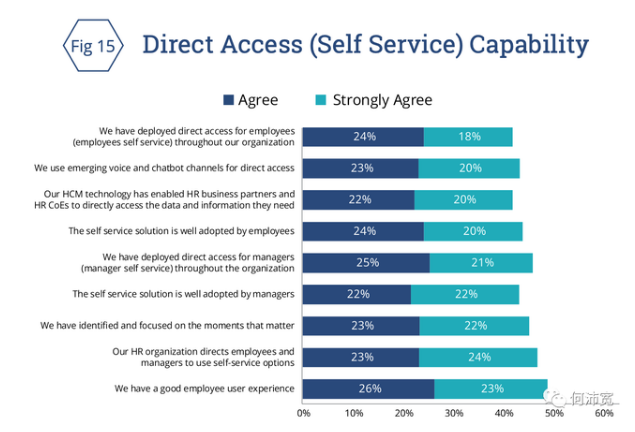 成熟的直接访问或自助服务能力,是人力资源技术和服务能提供一个关键组成部分。图15显示了受访者对一系列关于其人力资源自助服务功能的反应。