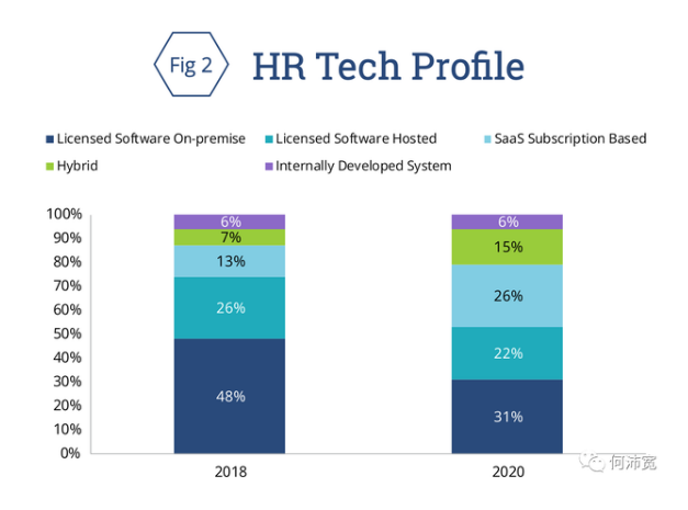 在过去的几年里,SaaS已经成为未来人力资源技术的明确选择,本次调查的结果也印证了这一趋势。然而,尽管需求依然强劲,但数据显示,企业转向SaaS的速度可能没有预期的那么快。图2(Fig2)呈现了调查参与者的总体反应:受访者回应企业当前(主要)人力资源技术模型的概要,以及他们2020年对人力资源技术使用的概要。
