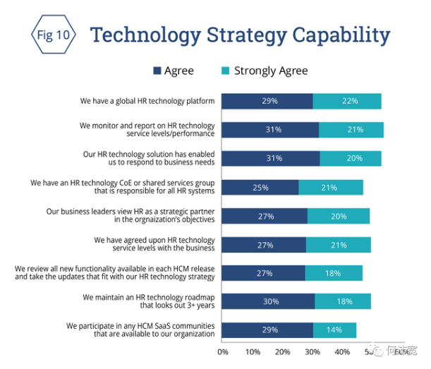 52%的受访者认为战略技术模型包括监测和报告人力资源技术服务水平/绩效。越来越少的组织说他们正在实现与业务的一致性和联系。不到一半(48%)的受访者表示,他们已经就自己的人力资源技术服务水平与企业业务达成一致。只有20%的人强烈同意,27%的人同意他们的企业领导人将人力资源视为战略合作伙伴。(一定程度反映了:HRTech落地后,并没有与业务端紧密联系)