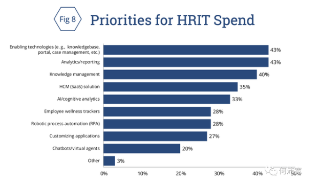 受访者在回应在未来两年内如何投资人力资源技术时,“赋能型技术(知识库、门户、案例管理)与分析”排名第一。图8显示了受访者是如何回答的:下面人力资源技术哪个类别会优先支出?