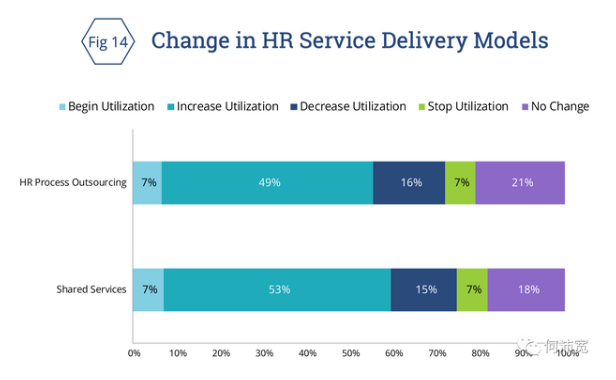 如图14所示,受访者表示,共享服务和外包的进一步采用将继续增加,近一半的受访者预计,人力资源流程外包的使用将增加,共享服务(shared services)交付模式的将增加53%。