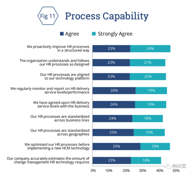 近一半(47%)的受访者表示,他们正在以结构化的方式主动改进自己的人力资源流程。同样,45%的公司同意或强烈同意他们的人力资源流程与他们的人力资源技术平台相一致。这些结果表明,企业在技术支持的同时还没有持续地优化流程。这些答复还表明,在跨区域和业务线协调流程和系统方面存在着机会。
