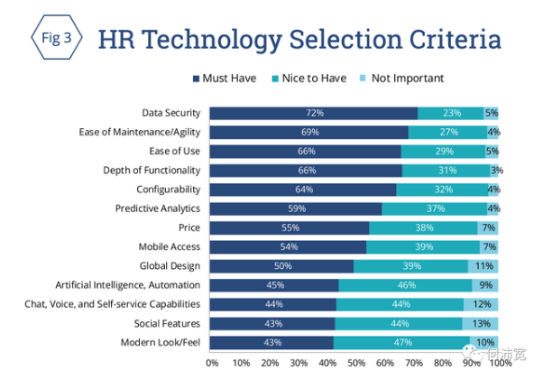 随着市场上人力资源技术解决方案的涌入,优先选择标准成为做出正确技术决策的关键。图3显示了驱动人力资源技术选择决策的标准,以及将每个标准描述为“必须具备”、“很好具备”或“不重要”的受访者百分比。