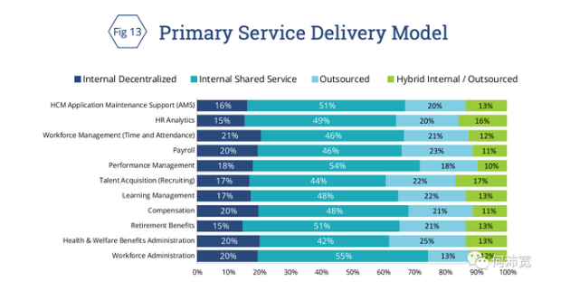 超过四分之三的受访者表示,他们的人力资源活动使用内部共享服务模式、外包或混合内部共享服务/外包模式。下面的图13显示了参与者用于各种人力资源功能的主要交付模型调查。
