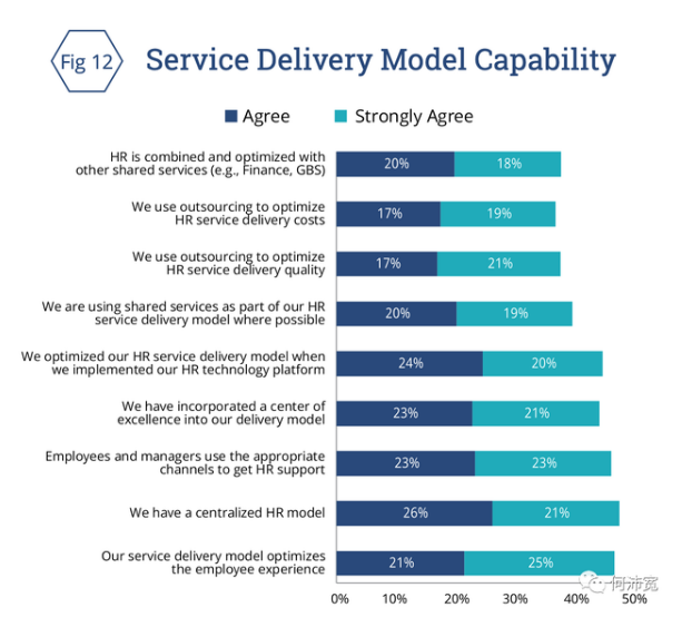 除了优化流程外,企业还有一个关键机会,通过改进相关的人力资源服务交付模式,最大限度地提高技术投资回报。调查结果表明,这是人力资源组织有足够发展空间的另一个领域。图12显示了受访者一系列关于HR服务交付模型的声明的响应。