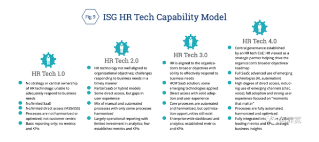 美国的信息服务商ISG做了一份关联报告:《迈向数字时代:2019年人力资源技术和服务交付的行业趋势》(《MOVING UP THE DIGITAL LADDER: 2019 Industry Trends in HR Technology and Service Delivery》),它梳理了美国人力资源技术和服务(线上化HRTech为核心)的行业现状,基于现有问题提出了一些思考方向:对人力资源行业的挑战和机会是什么,如何进一步推动企业通过升级人力资源技术能力完成数字化转型?