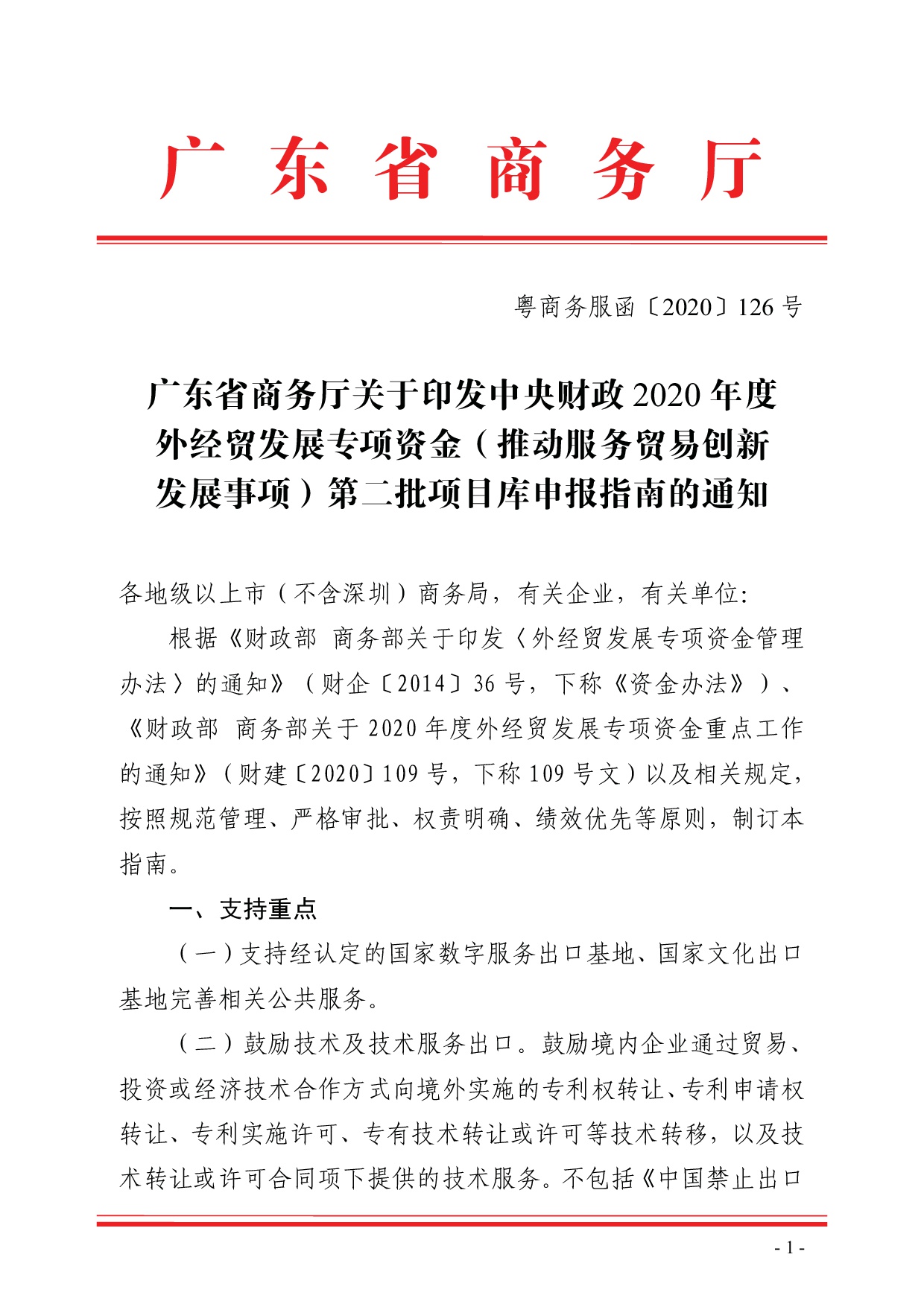 广东省商务厅关于印发中央财政2020年度外经贸发展专项资金(推动服务贸易创新发展事项)第二批项目库申报指南的通知.jpg